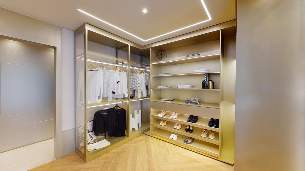 Nesta opção, parte de uma das suítes foi aproveitada para aumentar o closet, o banheiro da suíte máster e o living, conservando a privacidade da área íntima.