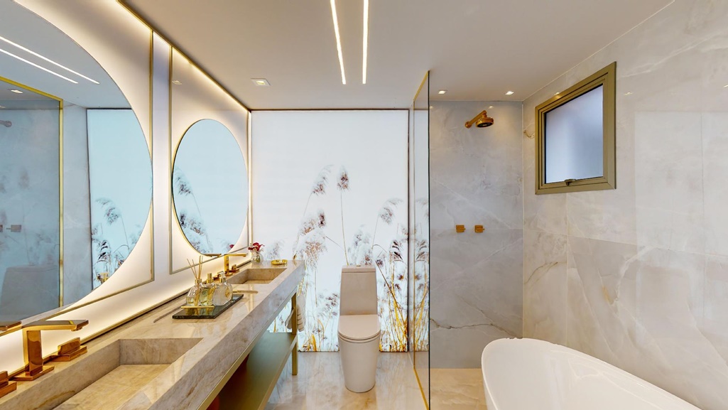 Nesta opção, um dos dormitórios foi aproveitada para aumentar o living, conservando a privacidade da área íntima em 3 suítes.