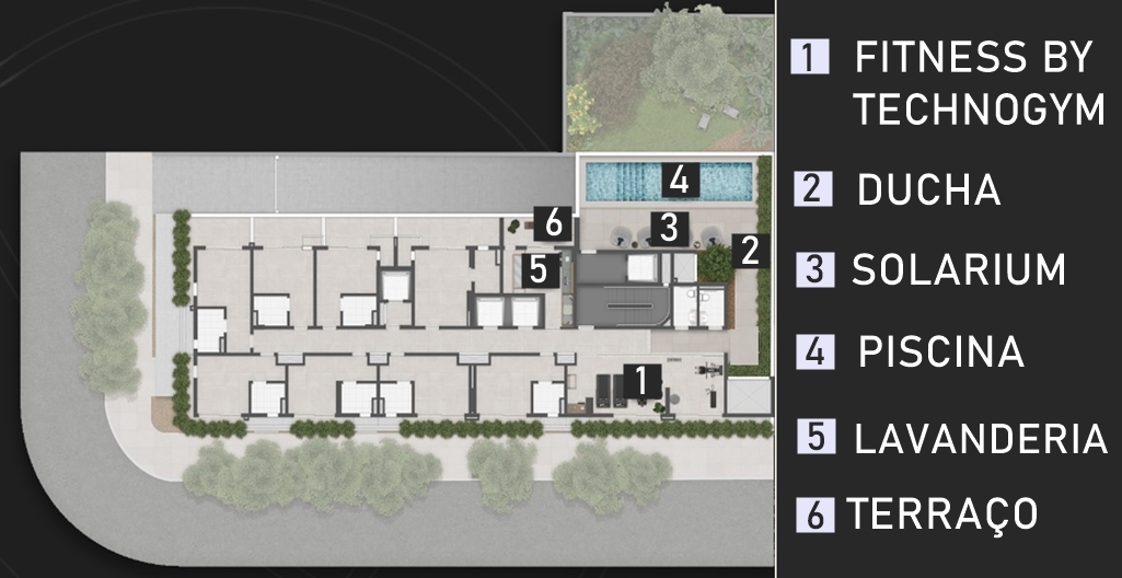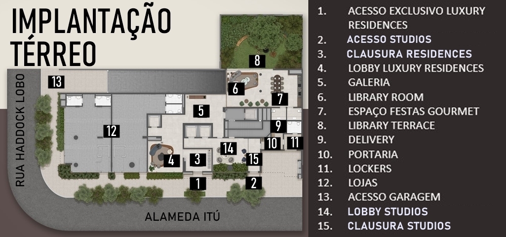 DISTRIBUIÇÃO DAS ÁREAS COMUNS E LAZER NO 1O. PAVIMENTO PARA ACESSO EXCLUSIVO DOS STUDIOS (LUXURY APARTMENTS)
