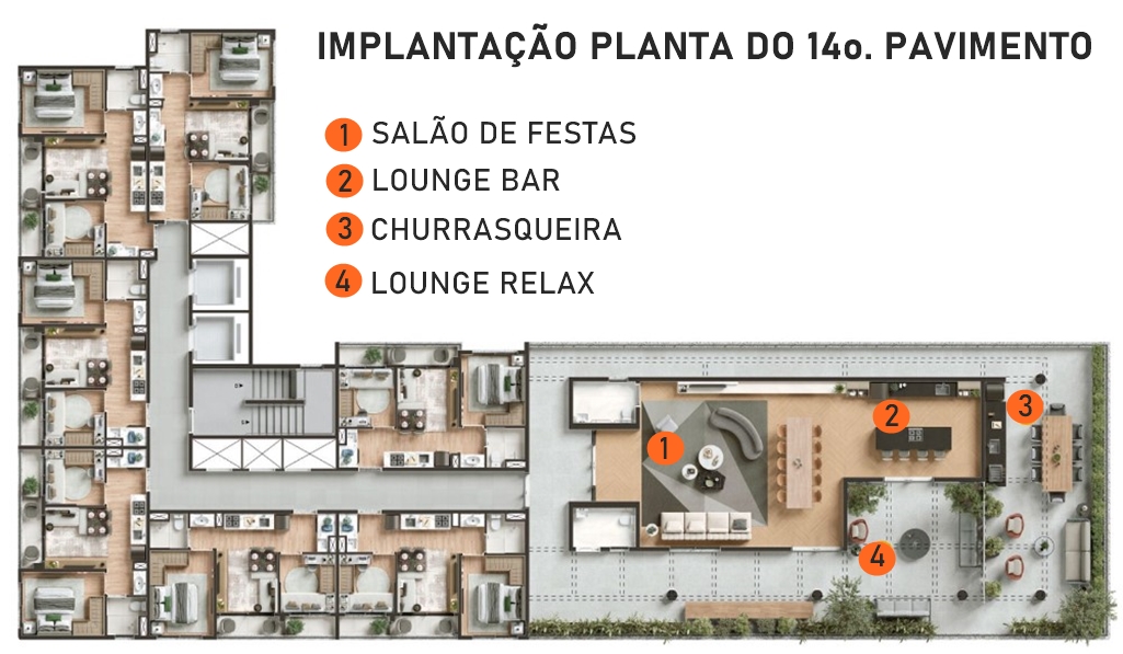 DISTRIBUIÇÃO DAS ÁREAS DE LAZER NO 14o. PAVIMENTO