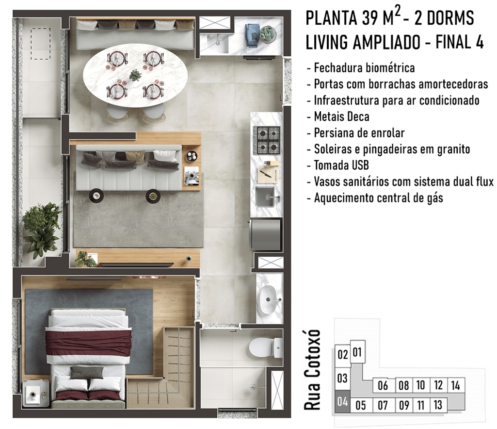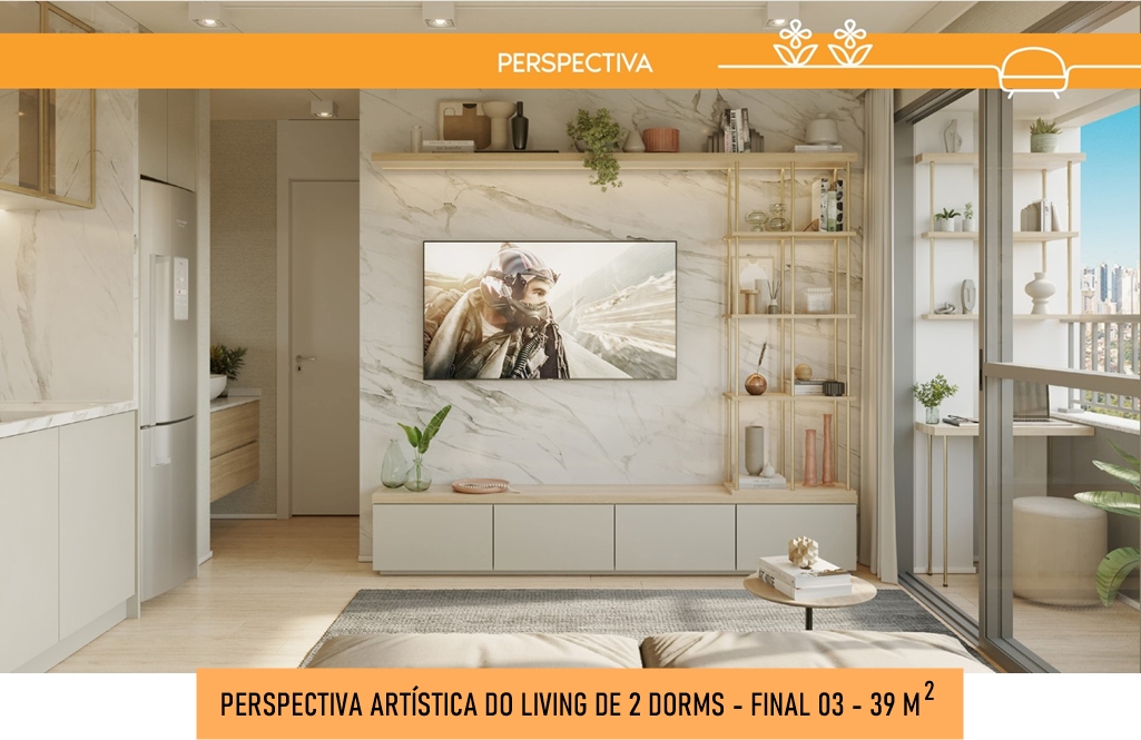 PERSPECTIVA ARTÍSTICA DO LIVING AMPLIADO (OPÇÃO) DO APARTAMENTO DE 39 M2