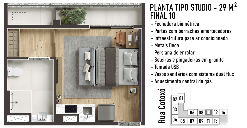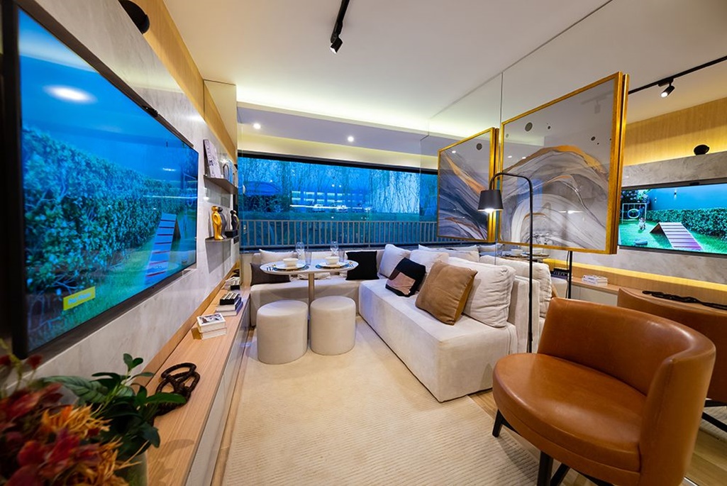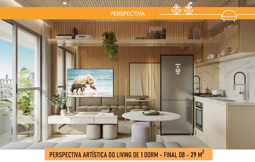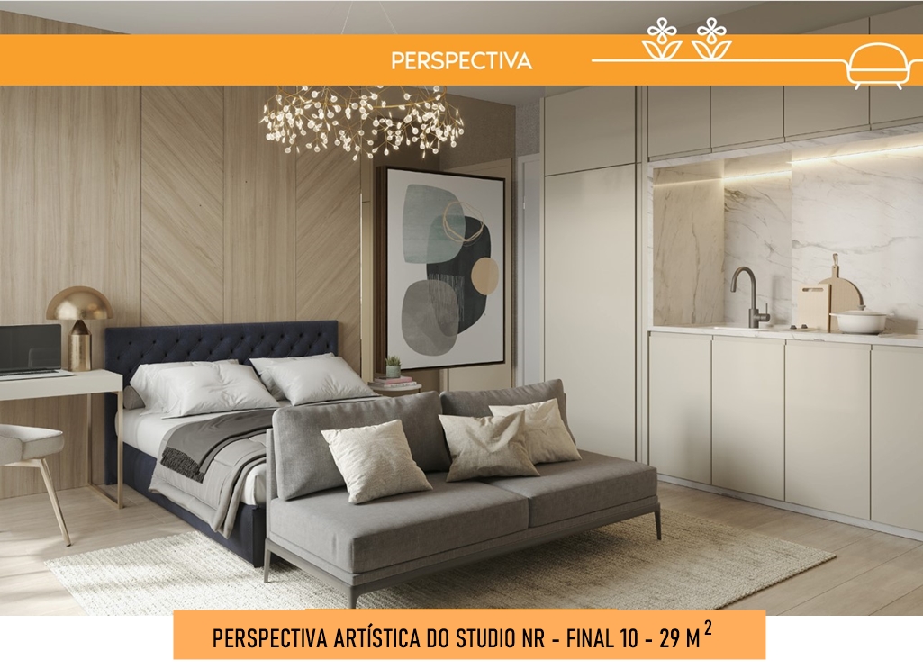 PERSPECTIVA ARTÍSTICA DO LIVING DO STUDIO NR DE 29 M2