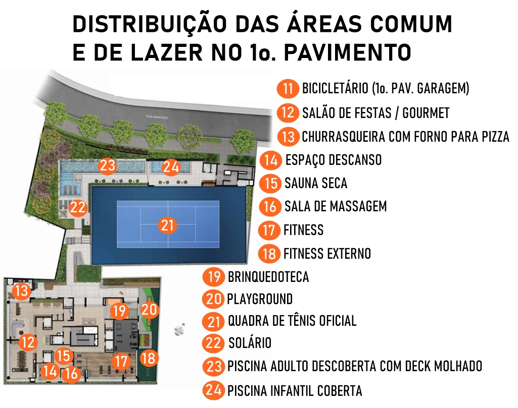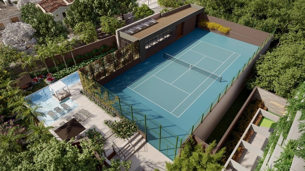 VÔO DA ÁREA DE LAZER COM DESTAQUE PARA A QUADRA DE TÊNIS