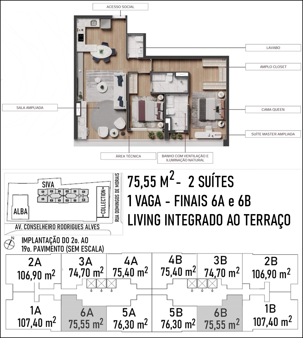 LIVING DO APARTAMENTO DE 75 M2 COM SUGESTÃO DE DECORAÇÃO