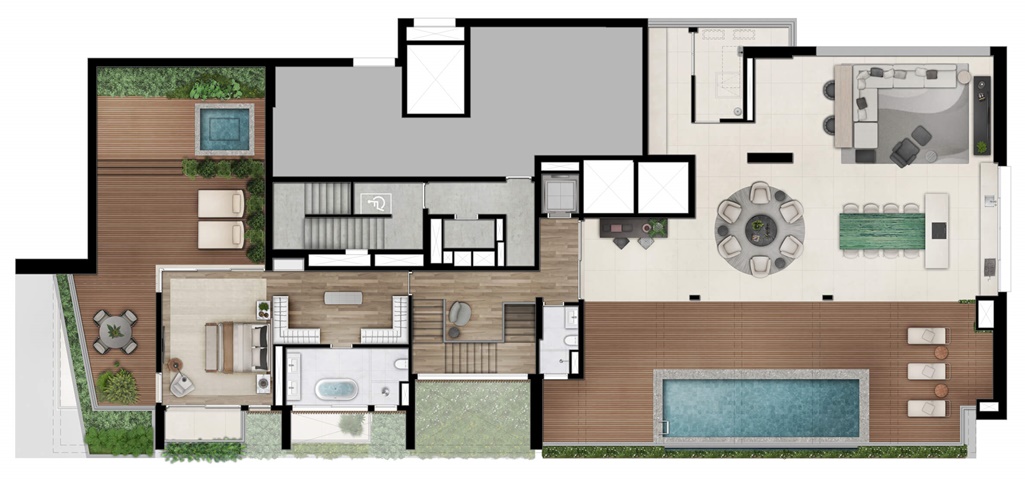 A PLANTA DA COBERTURA FOI DESENHADA E DIMENSIONADA PARA O CONFORTO E BEM ESTAR DE UMA FAMÍLIA EM TODOS OS SEUS NÍVEIS