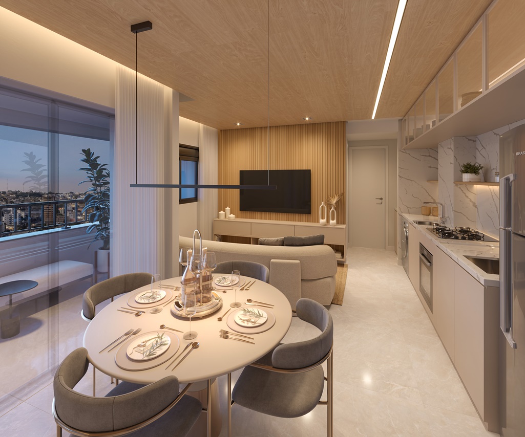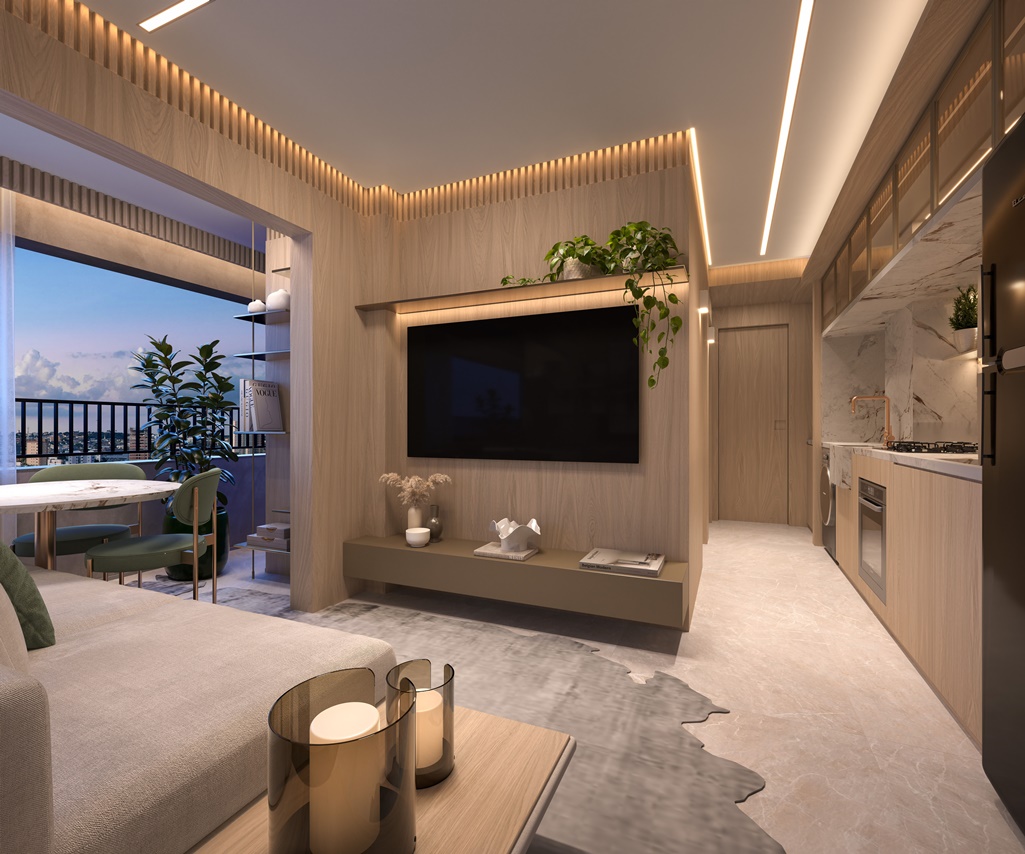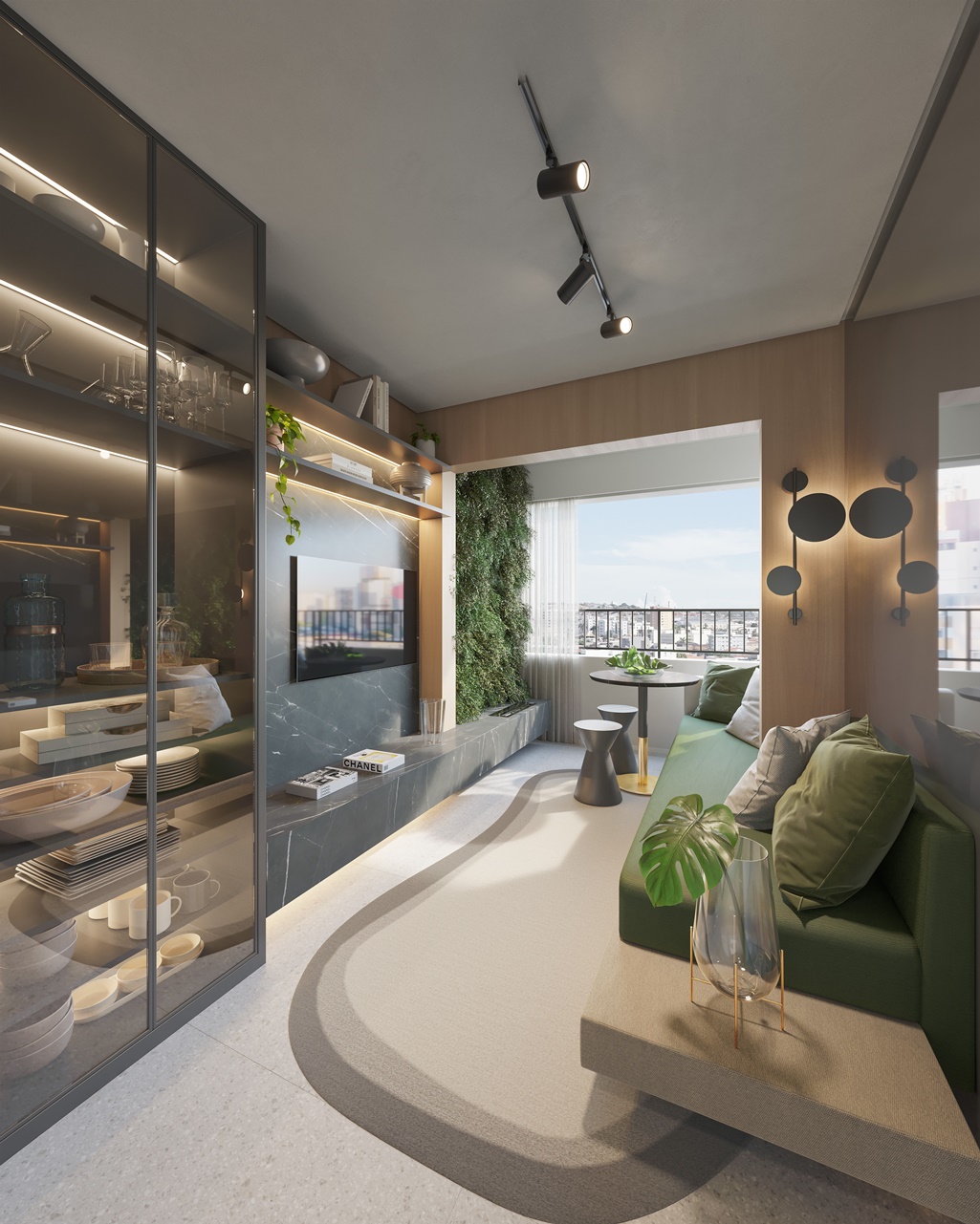 SUGESTÃO DE DECORAÇÃO PARA O LIVING AMPLIADO DO APARTAMENTO OPÇÃO DE 40 M2