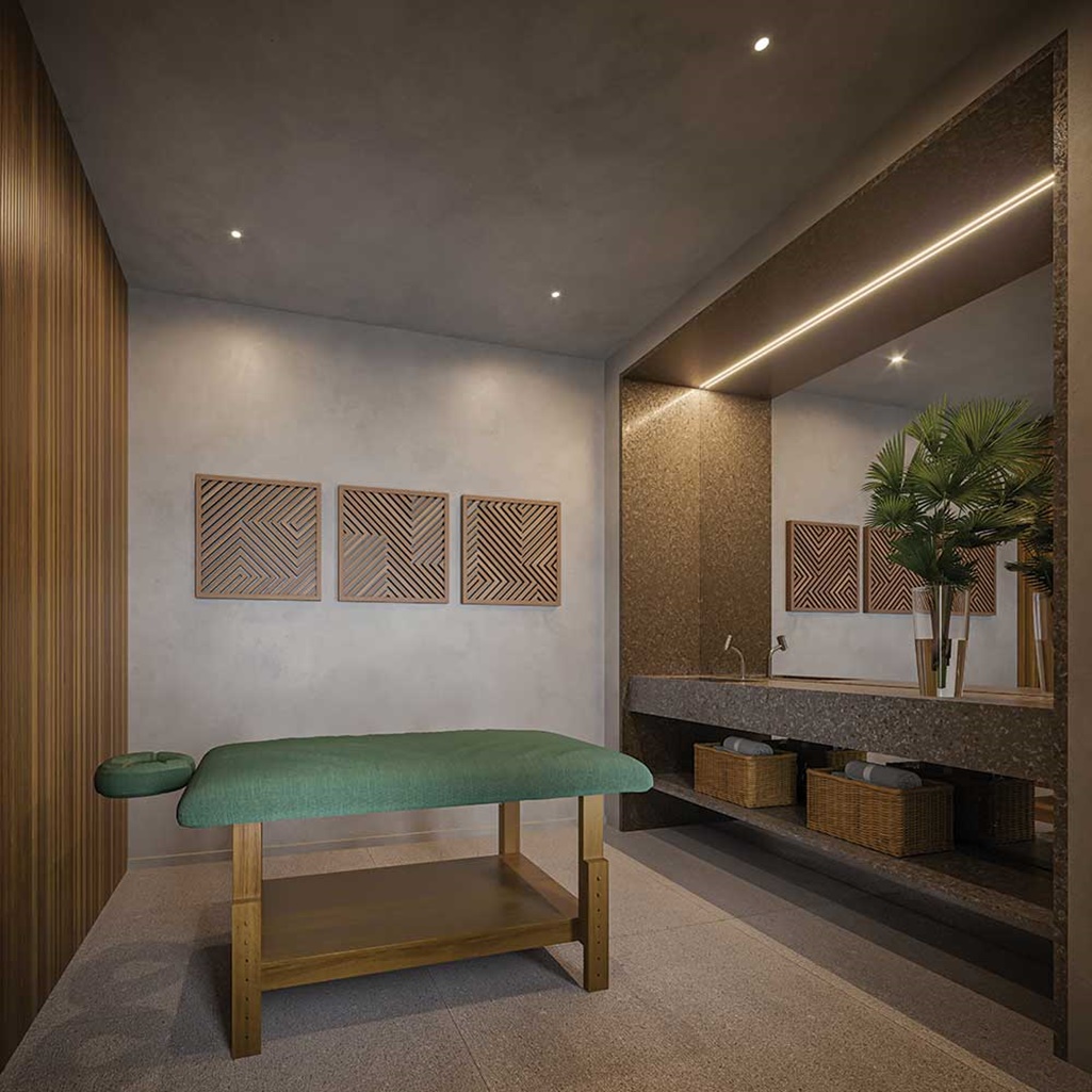O WELLNESS CENTER CONTEMPLA PISCINA COM RAIA DE 25 M, SALA DE MASSAGEM, SAUNA SECA* E HIDROMASSAGEM*