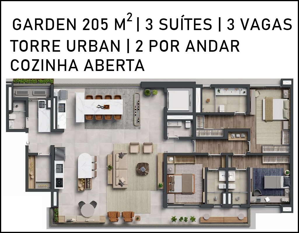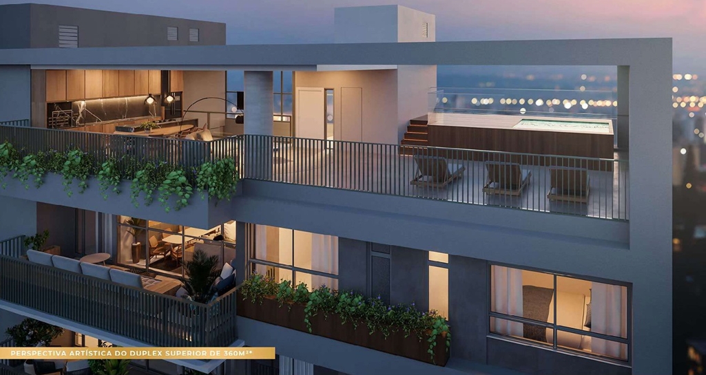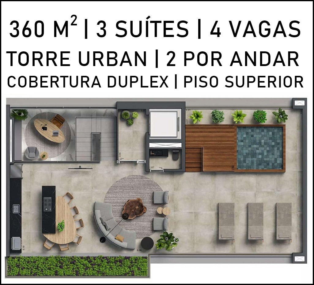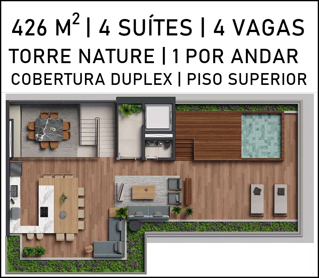 VOO DE PÁSSARO DO PISO INFERIOR E SUPERIOR DA COBERTURA DUPLEX DE 426 M2 COM SUGESTÃO DE DECORAÇÃO