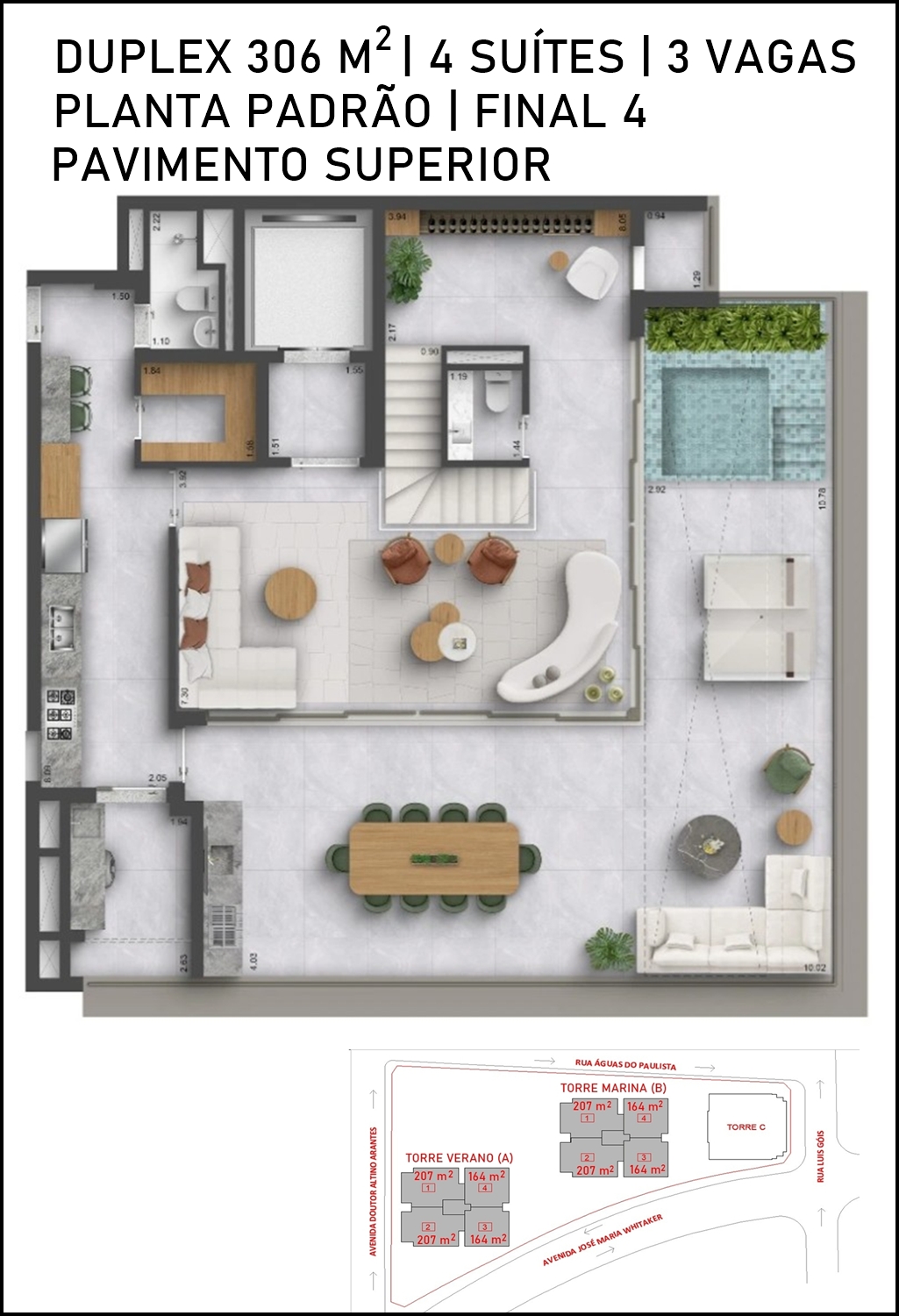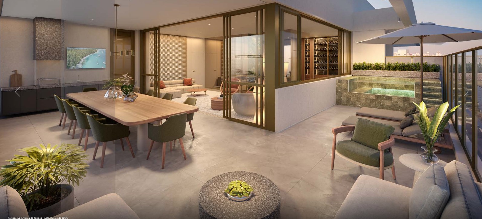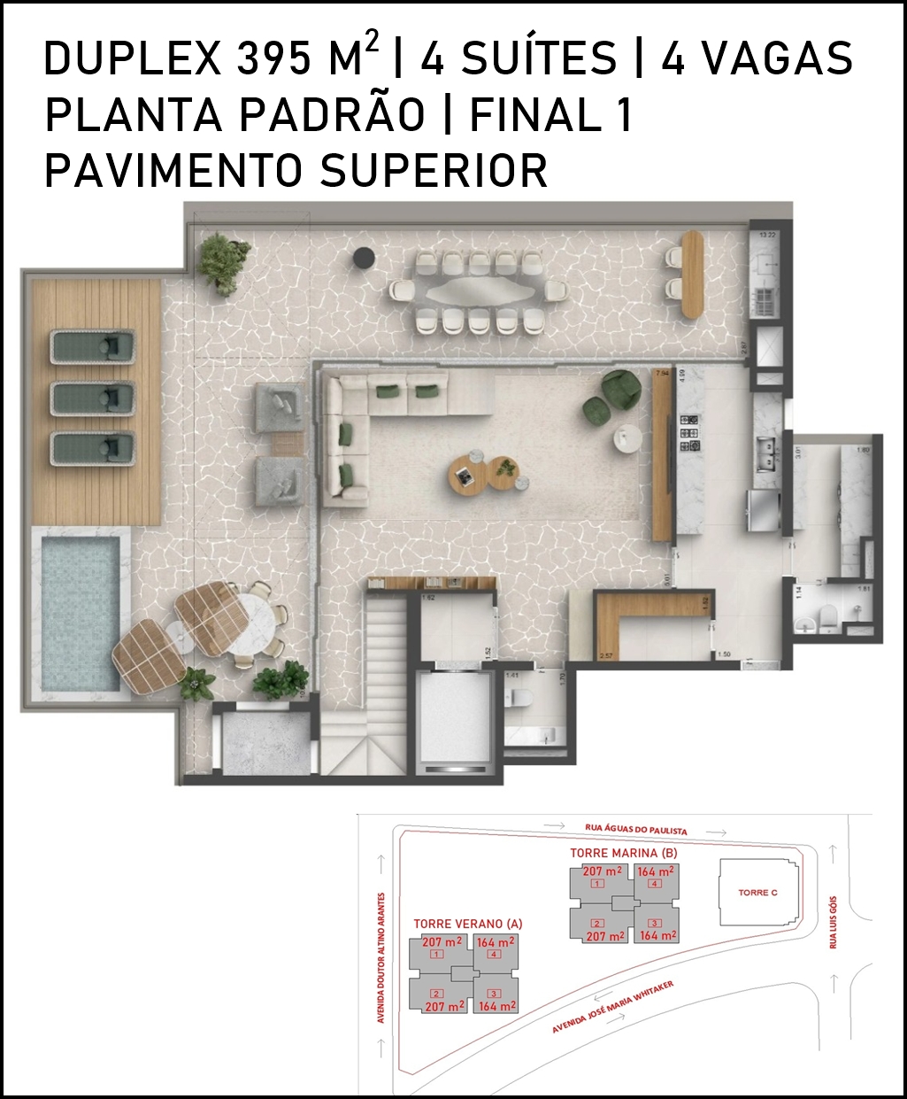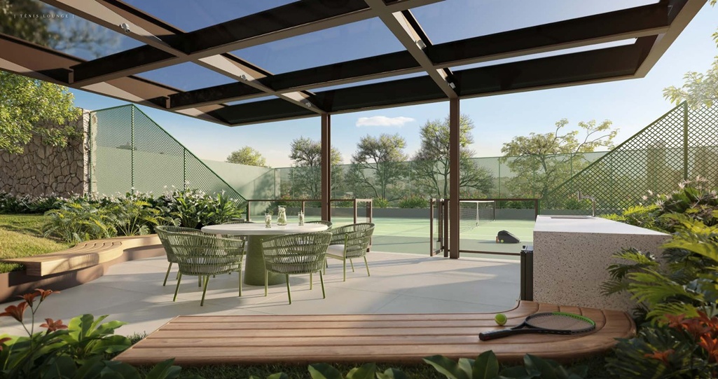 TERRAÇO DO PAVIMENTO SUPERIOR DO DUPLEX DE 306 M2 COM SUGESTÃO DE DECORAÇÃO