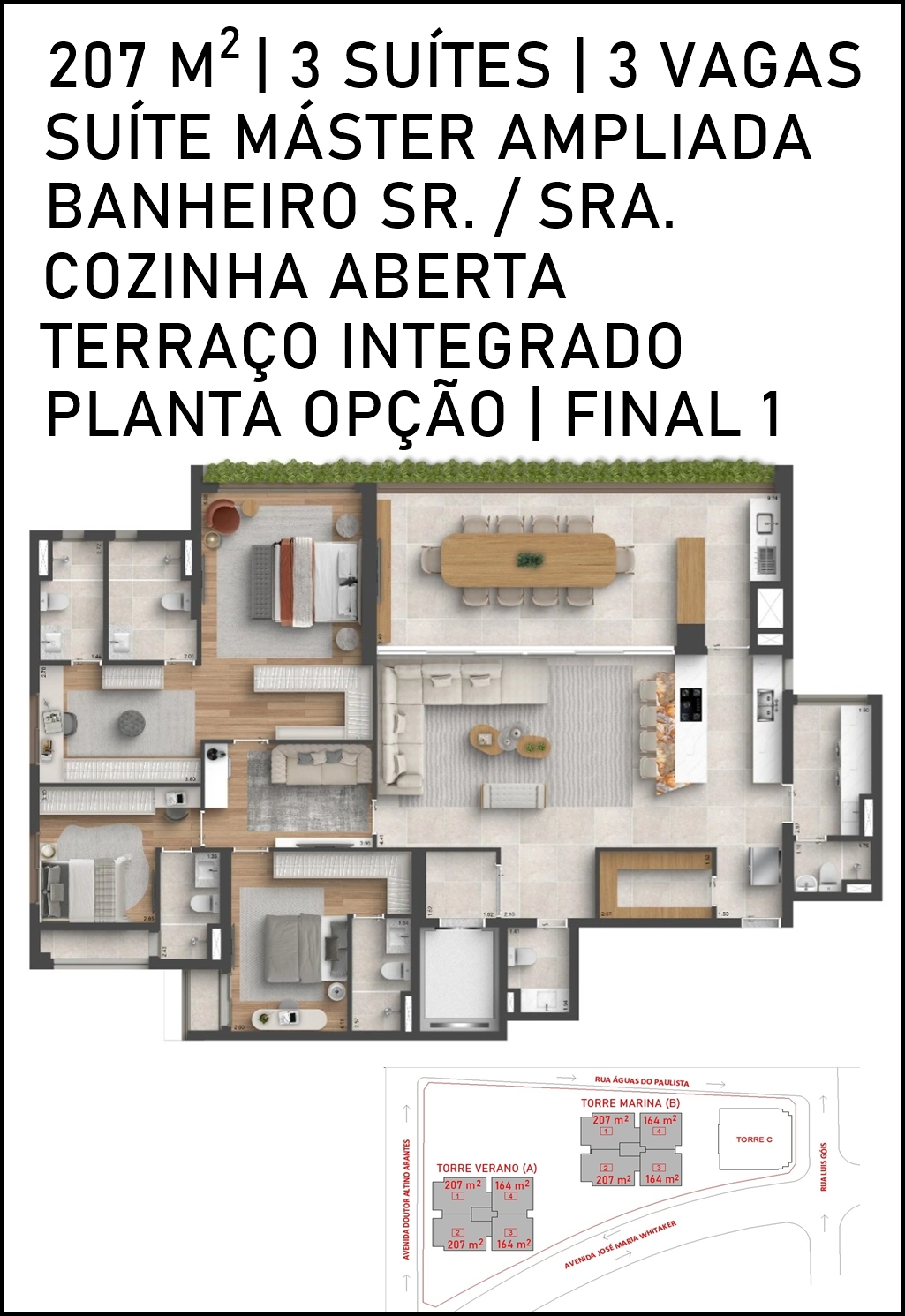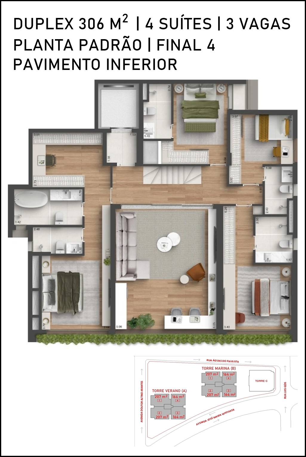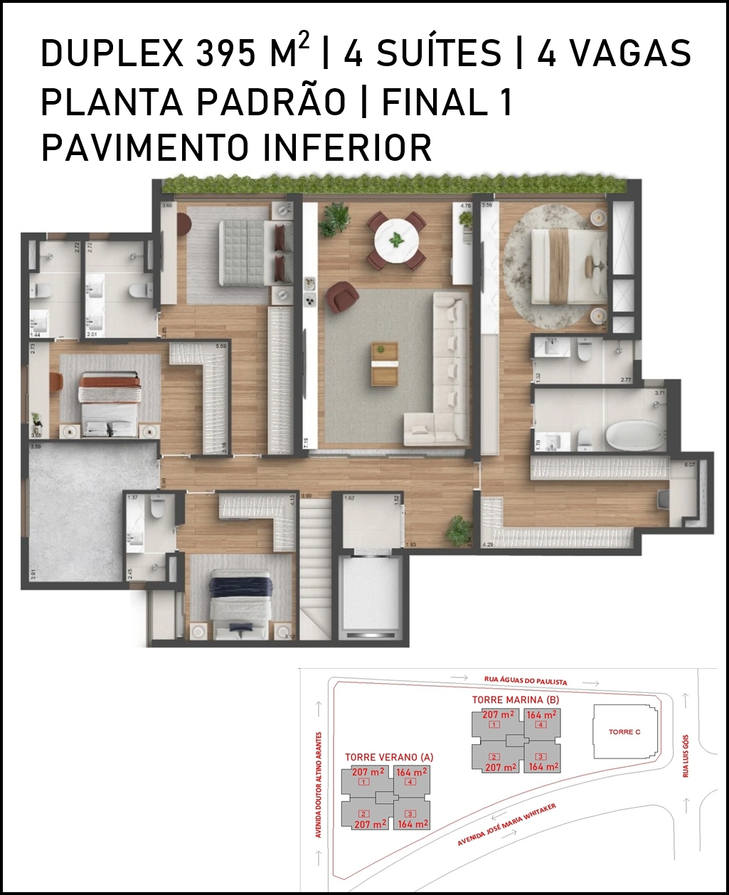 TERRAÇO DO PAVIMENTO SUPERIOR DO DUPLEX DE 306 M2 COM SUGESTÃO DE DECORAÇÃO
