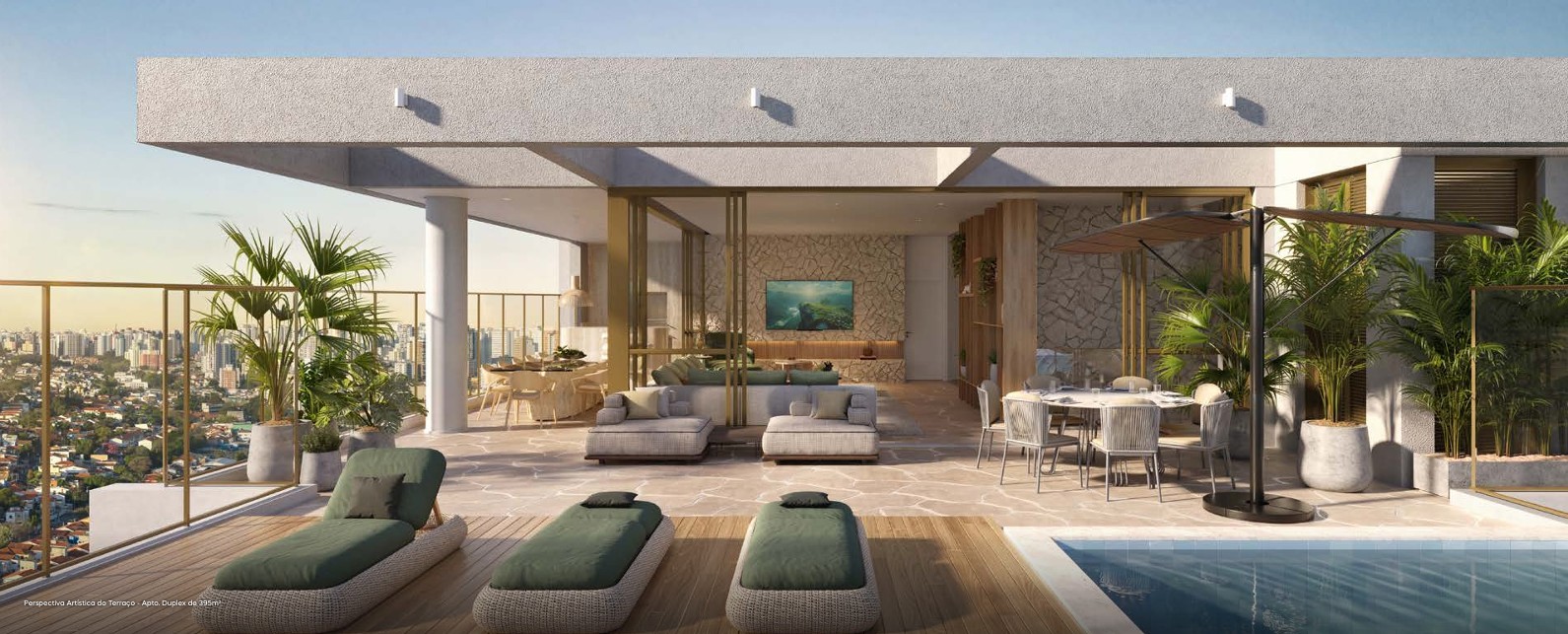TERRAÇO DO PAVIMENTO SUPERIOR DO DUPLEX DE 395 M2 COM SUGESTÃO DE DECORAÇÃO